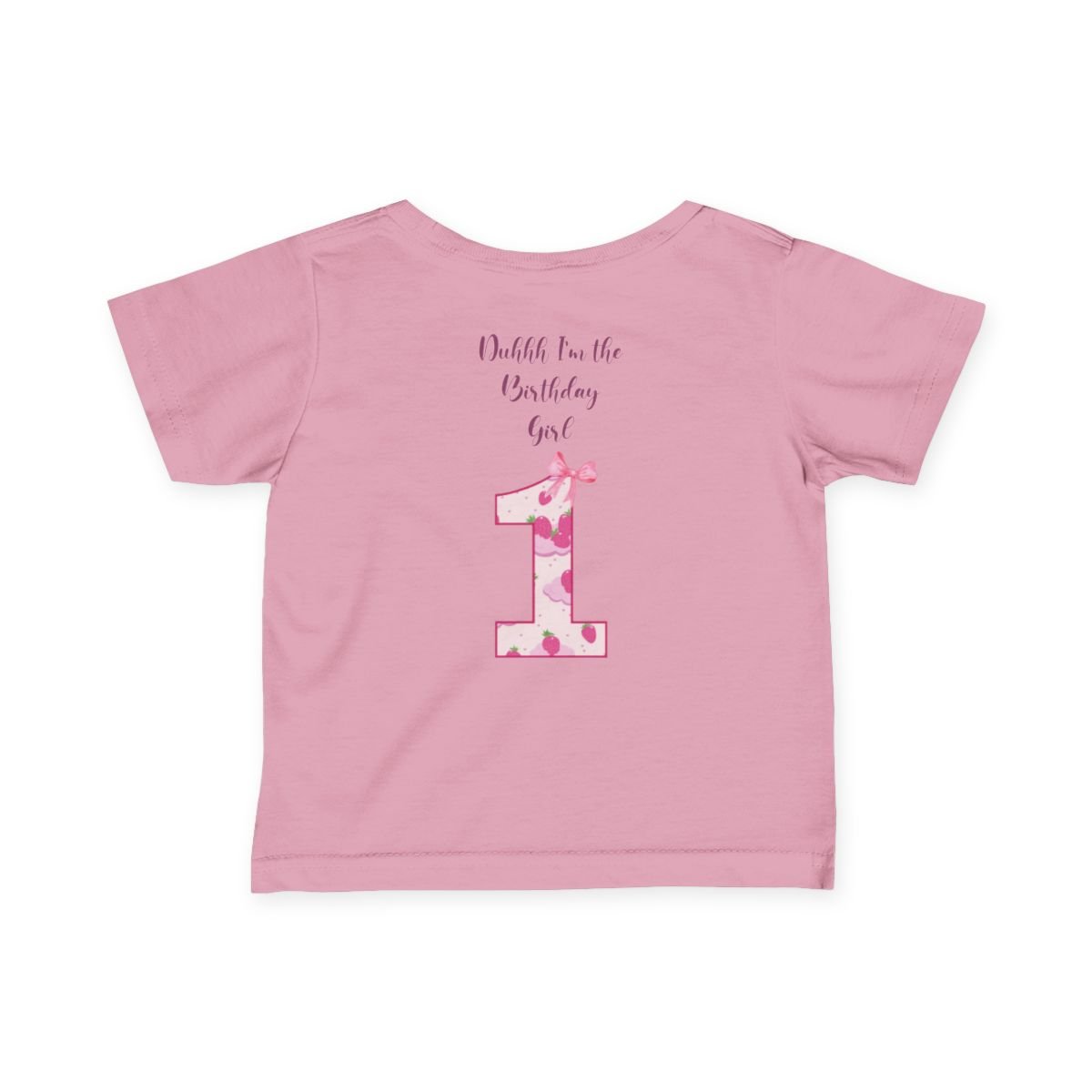 Soft, light, and thoughtfully made for tiny celebrations — this infant tee brings a gentle, whimsical touch to a little one’s first birthday. The front features a delicate “Berry 1st Birthday” motif with soft pink accents and tiny fruit details. On the back a large, floral number 1, creating a keepsake look that reads like a little storybook page. Short sleeves and a ribbed collar make it easy to pull on and comfortable for crawling, cuddling, and cake-smudged smiles. The tee’s classic fit and durable stitched side seams hold shape through washes, while the breathable, lightweight fabric keeps baby comfortable during party activities and nap time afterward.