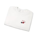 Soft, simple, and quietly sentimental — this crewneck settles into your day like a warm nod. Lightweight yet substantial, the white sweatshirt features small, embroidered accents: a tiny paired-heart motif and a subtle wordmark on the left chest, plus a stitched heart on the wrist. The cut is classic and roomy, with ribbed collar and cuffs that keep their shape. Wear it at home with coffee, layered under a jacket for a city walk, or on a slow weekend when comfort and understated detail matter most. The minimal embroidery reads personal, like a shared secret between you and someone you love.
